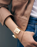 クリスタルガラスがパヴェセッティングされた華やかな留め具は、エッジのきいた手元を演出してくれます。