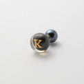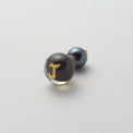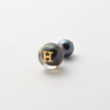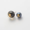 クリアな樹脂の中に、ブラックパールとイニシャルのプレートを閉じ込めたピアス。